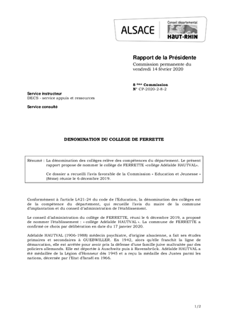 La dénomination des collèges relève des compétences du département. Le présent rapport propose de nommer le collège de FERRETTE «collège Adélaïde HAUTVAL». Ce dossier a recueilli l’avis favorable de la Commission « Education et Jeunesse » (8ème) réunie le 6 décembre 2019.
