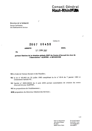 portant fixation de la dotation globale 2007 du centre d'accueil de jour de l'association "Alister" à MULHOUSE. Resumé Pièces jointes ARRETE Assemblée : Non défini Date : 11/06/2007 Rapporteur : Non défini Collectivité : Conseil départemental du Haut-Rhin Direction : Non défini Service : Service de la Tarification des Etablissements Domaine : Dotations financières Commission :