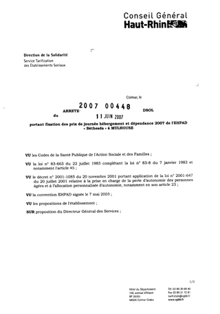 portant fixation des prix de journée hébergement et dépendance 2007 de l'EHPAD "Béthesda" à MULHOUSE. Resumé Pièces jointes ARRETE Assemblée : Non défini Date : 11/06/2007 Rapporteur : Non défini Collectivité : Conseil départemental du Haut-Rhin Direction : Non défini Service : Service de la Tarification des Etablissements Domaine : Prix de Journée Commission :