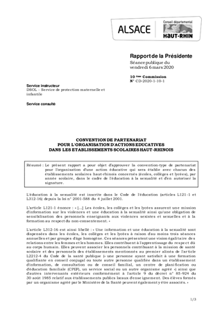 Le présent rapport a pour objet d’approuver la convention-type de partenariat pour l’organisation d’une action éducative qui sera établie avec chacun des établissements scolaires haut-rhinois concernés (écoles, collèges et lycées), par année scolaire, dans le cadre de l'éducation à la sexualité et d’en autoriser la signature.