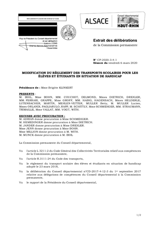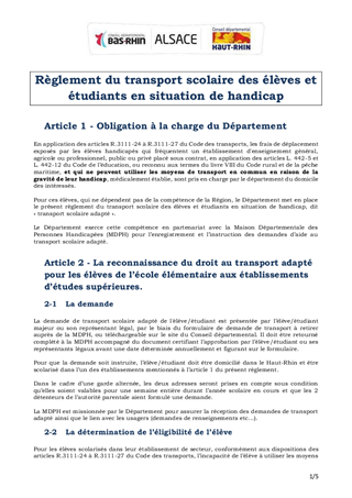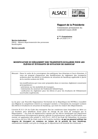 Dans le cadre de la convergence des politiques bas-rhinoises et haut-rhinoises, il vous est proposé d’approuver des modifications du règlement des transports scolaires pour les élèves et étudiants en situation de handicap applicable à partir de la rentrée scolaire de 2020. Les modifications qui vous sont proposées dans ce nouveau règlement concernent principalement : - précisions sur les modalités de transport, - valorisation du montant de l’indemnité kilométrique, - unification du règlement pour les élèves et pour les étudiants de l’élémentaire aux études supérieures.
