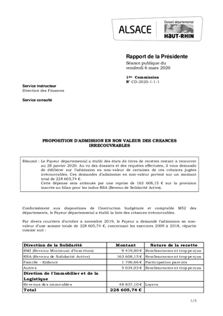 Le Payeur départemental a établi des états de titres de recettes restant à recouvrer au 28 janvier 2020. Au vu des dossiers et des requêtes effectuées, il vous demande de délibérer sur l’admission en non-valeur de certaines de ces créances jugées irrécouvrables. Ces demandes d’admission en non-valeur portent sur un montant total de 228 605,74 €. Cette dépense sera atténuée par une reprise de 163 608,15 € sur la provision inscrite au bilan pour les indus RSA (Revenu de Solidarité Active).