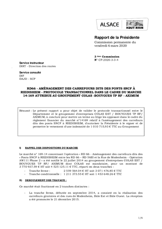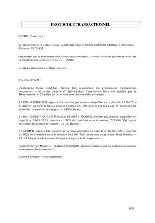 Le présent rapport a pour objet de valider le protocole transactionnel entre le Département et le groupement d'entreprises COLAS EST / BOUYGUES TP RF/ AXIMUM, à conclure pour mettre un terme au litige les opposant dans le cadre du règlement financier du marché n°14169 relatif à l’aménagement des carrefours dits des ponts SNCF à RIEDISHEIM, d'autoriser la Présidente à le signer et de permettre le versement d'une indemnité de 1 010 715,93 € TTC au Groupement