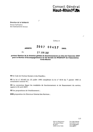 portant fixation de la dotation globale de fonctionnement au titre de l'exercice 2007 pour le service d'accompagnement à la vie sociale de PFASTATT de l'association Croix-Marine. Resumé Pièces jointes ARRETE Assemblée : Non défini Date : 21/06/2007 Rapporteur : Non défini Collectivité : Conseil départemental du Haut-Rhin Direction : Non défini Service : Service de la Tarification des Etablissements Domaine : Dotations financières Commission :