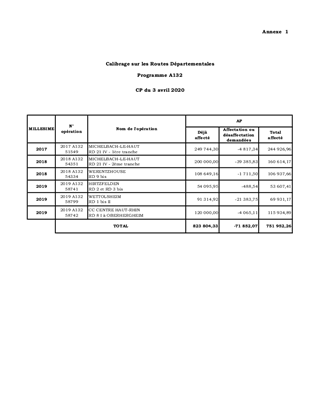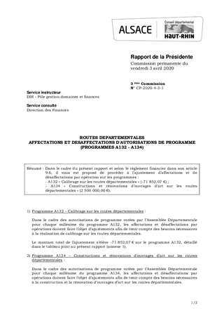 Dans le cadre du présent rapport et selon le règlement financier dans son article 9.6, il vous est proposé de procéder à l’ajustement d’affectations et de désaffectations par opération sur les programmes : - A132 « Calibrage sur les routes départementales » (-71 852,07 €) ; - A134 « Constructions et rénovations d’ouvrages d’art sur les routes départementales » (2 500 000,00 €).