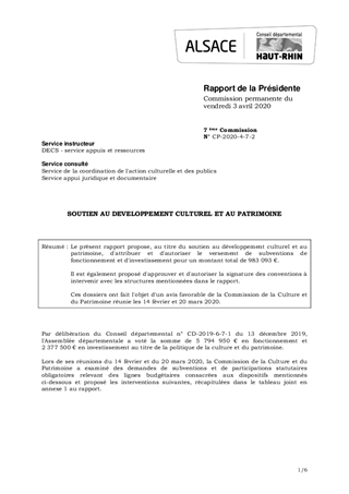 Le présent rapport propose, au titre du soutien au développement culturel et au patrimoine, d'attribuer et d'autoriser le versement de subventions de fonctionnement et d'investissement pour un montant total de 983 093 €. Il est également proposé d'approuver et d'autoriser la signature des conventions à intervenir avec les structures mentionnées dans le rapport. Ces dossiers ont fait l'objet d'un avis favorable de la Commission de la Culture et du Patrimoine réunie les 14 février et 20 mars 2020.