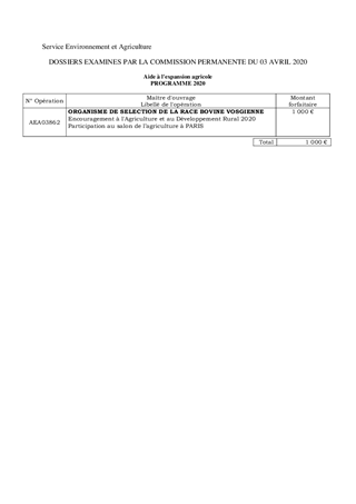 Le Département encourage la mise en œuvre de projets en faveur de la préservation de l’environnement, du développement durable et propose de soutenir, à ce titre, l’organisme de sélection de la race bovine vosgienne pour un montant de 1 000 € pour sa participation au salon de l’agriculture de PARIS et 2 000 € pour l’organisation de la semaine des races de Massif. Il vous est proposé de donner un avis favorable à cette demande. Ce rapport a fait l’objet d’un avis favorable de la commission thématique de l’Agriculture, de l’Environnement du Cadre de Vie réunie le 20 mars 2020.