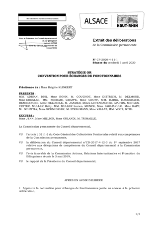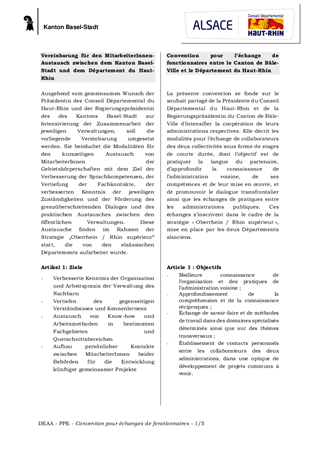Dans le cadre de la Stratégie « OR », il est proposé de signer une convention pour échanges de fonctionnaires avec le Canton de Bâle-Ville, sur le modèle de la convention signée avec 5 collectivités allemandes. Le principe de l’élargissement des conventions d’échanges à d’autres collectivités a fait l’objet d’un avis favorable de la Commission Actions, Relations Internationales et Promotion du Bilinguisme, réunie le 3 mai 2019.