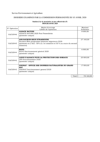 Le présent rapport propose la répartition des crédits de fonctionnement et d’investissement entre diverses associations dans le cadre du programme de soutien à la vie associative et aux collectivités. Il s’agit de la Ligue pour la Protection des Oiseaux Alsace (20 000 €), l’Office des Données Naturalistes - ODONAT (17 000 €), BUFO (6 000 €), Saumon-Rhin (27 160 €), Alsace Nature (8 000 €) et la Fédération du Haut Rhin pour la pêche et la protection du milieu aquatique (1 000 €). Le montant des aides proposées se répartit comme suit : 78 160 € pour le fonctionnement et 1 000 € au titre de l’investissement. Ce rapport a fait l'objet d'un avis favorable de la 6ème Commission réunie le 20 mars 2020.