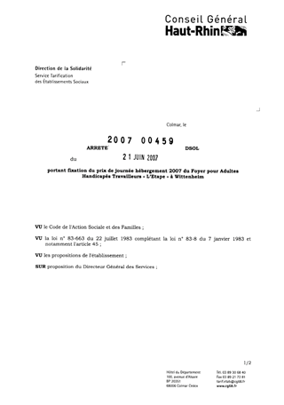 portant fixation du prix de journée hébergement 2007 du foyer pour adultes handicapés travailleurs "l'Etape" à WITTENHEIM. Resumé Pièces jointes ARRETE Assemblée : Non défini Date : 21/06/2007 Rapporteur : Non défini Collectivité : Conseil départemental du Haut-Rhin Direction : Non défini Service : Service de la Tarification des Etablissements Domaine : Prix de Journée Commission :