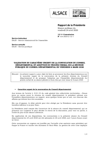 Le présent rapport a pour objet de faire se prononcer les élus départementaux sur le caractère urgent de la convocation de la présente réunion du Conseil départemental et de proposer l’adoption par l'Assemblée départementale du procès-verbal de sa séance plénière à huis clos qui s'est tenue le 6 mars 2020