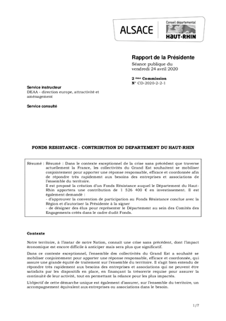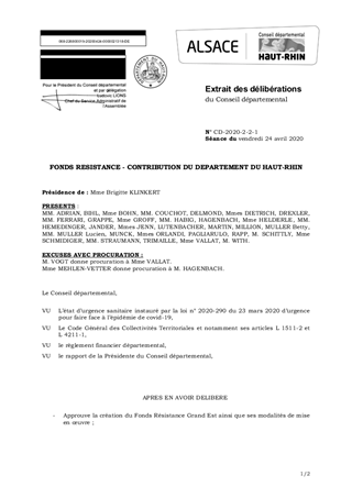 FONDS RESISTANCE - CONTRIBUTION DU DEPARTEMENT DU HAUT-RHIN