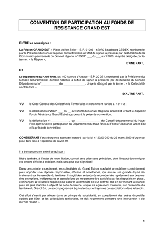 Résumé : Dans le contexte exceptionnel de la crise sans précédent que traverse actuellement la France, les collectivités du Grand Est souhaitent se mobiliser conjointement pour apporter une réponse responsable, efficace et coordonnée afin de répondre très rapidement aux besoins des entreprises et associations de l’ensemble du territoire. Il est proposé la création d’un Fonds Résistance auquel le Département du Haut-Rhin apportera une contribution de 1 526 400 € en investissement. Il est également demandé : - d’approuver la convention de participation au Fonds Résistance conclue avec la Région et d’autoriser la Présidente à la signer - de désigner des élus pour représenter le Département au sein des Comités des Engagements créés dans le cadre dudit Fonds.