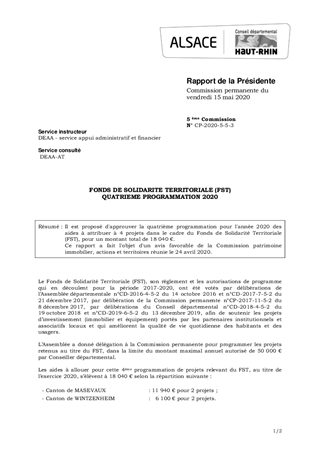 Il est proposé d'approuver la quatrième programmation pour l'année 2020 des aides à attribuer à 4 projets dans le cadre du Fonds de Solidarité Territoriale (FST), pour un montant total de 18 040 €. Ce rapport a fait l'objet d'un avis favorable de la Commission patrimoine immobilier, actions et territoires réunie le 24 avril 2020.