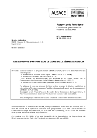 Dans le cadre de la programmation GERPLAN 2020, le Conseil départemental est sollicité pour : - la plantation de fruitiers haute tige à THANNENKIRCH (1 295 €), - la plantation d’arbres à SAUSHEIM (1 297 €), - des actions de sensibilisation des scolaires et du grand public par la Communauté de Communes de la Vallée de Kaysersberg (11 993 €), - la réalisation d’une amélioration pastorale à SOULTZEREN (32 219 €). Par ailleurs, il vous est proposé de bien vouloir proroger le délai de validité de la subvention afférente au dossier d’amélioration pastorale porté par la commune de MITZACH (GPL 04167). Ce rapport a fait l’objet d’un avis favorable de la Commission de l’Agriculture, de l’Environnement et du Cadre de Vie réunie en séance du 20 mars 2020. Il vous est proposé de donner un avis favorable à l’ensemble de ces demandes.