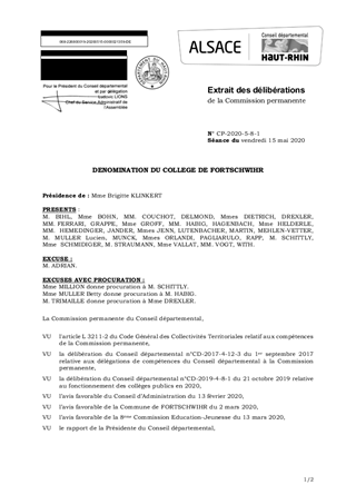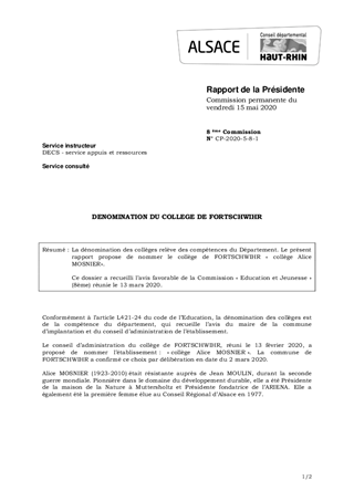 La dénomination des collèges relève des compétences du Département. Le présent rapport propose de nommer le collège de FORTSCHWIHR « collège Alice MOSNIER». Ce dossier a recueilli l’avis favorable de la Commission « Education et Jeunesse » (8ème) réunie le 13 mars 2020.