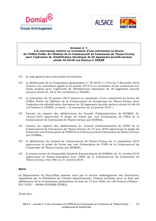 AVENANT N°1 A LA CONVENTION RELATIVE AU VERSEMENT D'UNE SUBVENTION EN FAVEUR DE L'OPH THANN-CERNAY