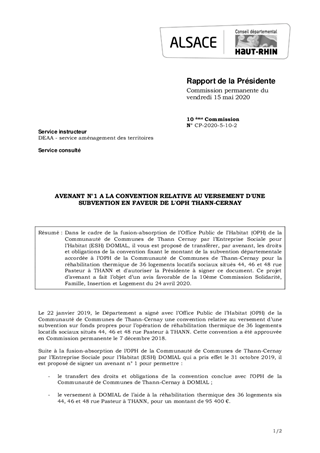 Dans le cadre de la fusion-absorption de l’Office Public de l’Habitat (OPH) de la Communauté de Communes de Thann Cernay par l’Entreprise Sociale pour l’Habitat (ESH) DOMIAL, il vous est proposé de transférer, par avenant, les droits et obligations de la convention fixant le montant de la subvention départementale accordée à l’OPH de la Communauté de Communes de Thann-Cernay pour la réhabilitation thermique de 36 logements locatifs sociaux situés 44, 46 et 48 rue Pasteur à THANN et d'autoriser la Présidente à signer ce document. Ce projet d’avenant a fait l’objet d’un avis favorable de la 10ème Commission Solidarité, Famille, Insertion et Logement du 24 avril 2020.