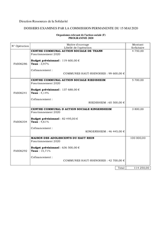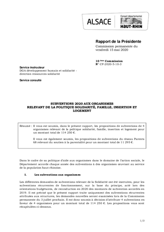 Il vous est soumis, dans le présent rapport, les propositions de subventions de 4 organismes relevant de la politique solidarité, famille, insertion et logement pour un montant total de 114 250 €. Il vous est également soumis, les propositions de subventions du réseau Parents 68 relevant du soutien à la parentalité pour un montant total de 11 295 €.