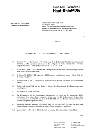 portant déclassement dans le domaine privé du Département de parcelles de terrain sur la commune de ASPACH - RD 466. Resumé Pièces jointes ARRETE Assemblée : Non défini Date : 27/06/2007 Rapporteur : Non défini Collectivité : Conseil départemental du Haut-Rhin Direction : Non défini Service : Service du Patrimoine et du droit des Sols Domaine : Déclassement de voirie Commission :