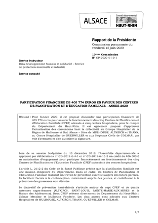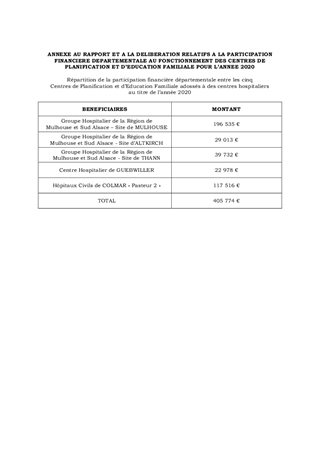 Pour l’année 2020, il est proposé d’accorder une participation financière de 405 774 euros pour assurer le fonctionnement des cinq Centres de Planification et d’Education Familiale (CPEF) adossés à cinq centres hospitaliers, pour le compte du Département du Haut-Rhin. Il est également proposé d’approuver l’actualisation des conventions liant la collectivité au Groupe Hospitalier de la Région de Mulhouse et Sud Alsace – Sites de MULHOUSE, ALTKIRCH et THANN, au Centre Hospitalier de GUEBWILLER et aux Hôpitaux Civils de COLMAR, par voie d’avenants et d’en autoriser la signature.