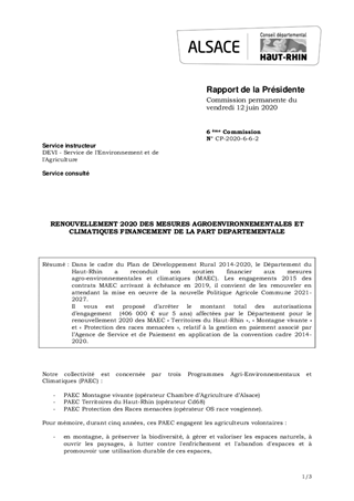 Dans le cadre du Plan de Développement Rural 2014-2020, le Département du Haut-Rhin a reconduit son soutien financier aux mesures agroenvironnementales et climatiques (MAEC). Les engagements 2015 des contrats MAEC arrivant à échéance en 2019, il convient de les renouveler en attendant la mise en oeuvre de la nouvelle Politique Agricole Commune 2021-2027. Il vous est proposé d’arrêter le montant total des autorisations d’engagement (406 000 € sur 5 ans) affectées par le Département pour le renouvellement 2020 des MAEC « Territoires du Haut-Rhin », « Montagne vivante » et « Protection des races menacées », relatif à la gestion en paiement associé par l’Agence de Service et de Paiement en application de la convention cadre 2014-2020.