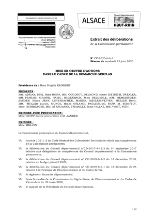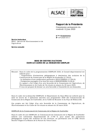 Dans le cadre de la programmation GERPLAN 2020, le Conseil départemental est sollicité pour : - l’organisation d’animations pédagogiques à destination des scolaires de la Communauté de Communes de la Région de Guebwiller (3 750 €), - la réalisation d’une amélioration pastorale à SOULTZEREN (17 004 €) - l’intégration paysagère d’un local de vente à BEBLENHEIM (3 656 €) Ce rapport a fait l’objet d’un avis favorable de la Commission de l’Agriculture, de l’Environnement et du Cadre de Vie réunie en séance du 20 mars 2020. Il vous est proposé de donner un avis favorable à l’ensemble de ces demandes.