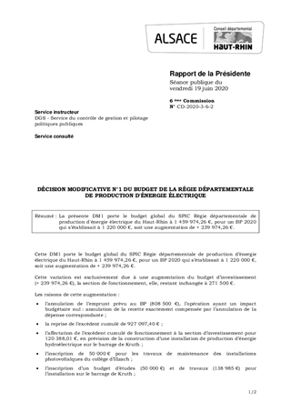 La présente DM1 porte le budget global du SPIC Régie départementale de production d'énergie électrique du Haut-Rhin à 1 459 974,26 €, pour un BP 2020 qui s’établissait à 1 220 000 €, soit une augmentation de + 239 974,26 €.