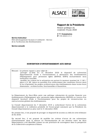 Le présent rapport a pour objet de : -proroger au-delà du 31 décembre 2020 le dispositif de subvention départementale d’aide à l’investissement à destination des établissements d’hébergement pour personnes âgées (EHPAD, EHPA) exclusivement sous tarification contrôlée, -modifier les critères de la subvention en portant le montant maximal de 11 K€ / place à 21 K€ /place en parallèle d’un renforcement des conditions d’octroi dans le but d’optimiser les projets architecturaux des établissements dans toutes leurs dimensions : architecturales, fonctionnelles et financières.