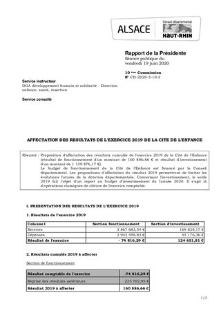 Proposition d'affectation des résultats cumulés de l'exercice 2019 de la Cité de l'Enfance (résultat de fonctionnement d'un montant de 160 886,66 € et résultat d'investissement d'un montant de 1 130 876,17 €). Le budget de fonctionnement de la Cité de l'Enfance est financé par le Conseil départemental. Les propositions d'affectation du résultat 2019 permettront de limiter les évolutions futures de la dotation départementale. Concernant l'investissement, le solde 2019 fait l'objet d'un report au budget d'investissement de l'année 2020. Il s'agit là d'opérations classiques de clôture de l'exercice comptable.