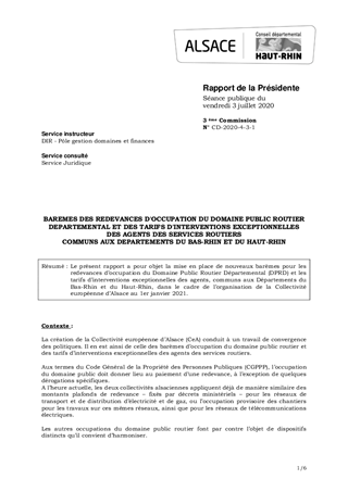 Le présent rapport a pour objet la mise en place de nouveaux barèmes pour les redevances d’occupation du Domaine Public Routier Départemental (DPRD) et les tarifs d’interventions exceptionnelles des agents, communs aux Départements du Bas-Rhin et du Haut-Rhin, dans le cadre de l’organisation de la Collectivité européenne d’Alsace au 1er janvier 2021.