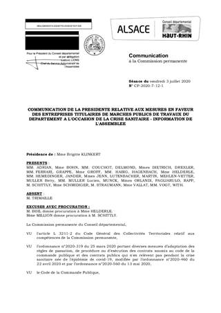 COMMUNICATION DE LA PRESIDENTE RELATIVE AUX MESURES EN FAVEUR DES ENTREPRISES TITULAIRES DE MARCHES PUBLICS DE TRAVAUX DU DEPARTEMENT A L'OCCASION DE LA CRISE SANITAIRE - INFORMATION DE L'ASSEMBLEE