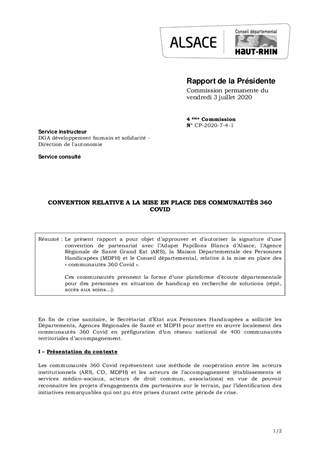 Le présent rapport a pour objet d’approuver et d’autoriser la signature d’une convention de partenariat avec l’Adapei Papillons Blancs d’Alsace, l’Agence Régionale de Santé Grand Est (ARS), la Maison Départementale des Personnes Handicapées (MDPH) et le Conseil départemental, relative à la mise en place des « communautés 360 Covid ». Ces communautés prennent la forme d’une plateforme d’écoute départementale pour des personnes en situation de handicap en recherche de solutions (répit, accès aux soins…).