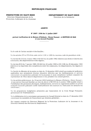 portant tarification de la maison d'enfants "Henry Dunant" à SEPPOIS LE BAS et son accueil familial. Resumé Pièces jointes ARRETE Assemblée : Non défini Date : 11/07/2007 Rapporteur : Non défini Collectivité : Conseil départemental du Haut-Rhin Direction : Non défini Service : Direction de la Solidarité Domaine : Autres (non classés) Commission :