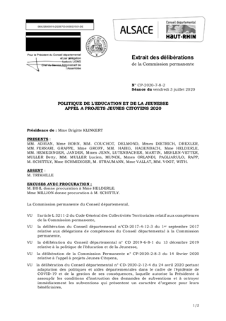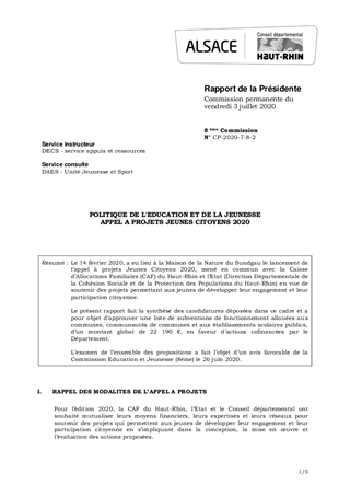 Le 14 février 2020, a eu lieu à la Maison de la Nature du Sundgau le lancement de l’appel à projets Jeunes Citoyens 2020, mené en commun avec la Caisse d’Allocations Familiales (CAF) du Haut-Rhin et l’Etat (Direction Départementale de la Cohésion Sociale et de la Protection des Populations du Haut-Rhin) en vue de soutenir des projets permettant aux jeunes de développer leur engagement et leur participation citoyenne. Le présent rapport fait la synthèse des candidatures déposées dans ce cadre et a pour objet d’approuver une liste de subventions de fonctionnement allouées aux communes, communautés de communes et aux établissements scolaires publics, d’un montant global de 22 190 €, en faveur d’actions cofinancées par le Département. L’examen de l’ensemble des propositions a fait l’objet d’un avis favorable de la Commission Education et Jeunesse (8ème) le 26 juin 2020.
