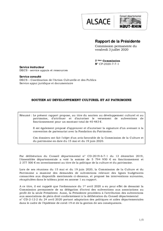 Le présent rapport propose, au titre du soutien au développement culturel et au patrimoine, d’attribuer et d’autoriser le versement de subventions de fonctionnement pour un montant total de 40 483 €. Il est également proposé d’approuver et d’autoriser la signature d’un avenant à la convention de partenariat avec la Fondation du Patrimoine. Ces dossiers ont fait l'objet d'un avis favorable de la Commission de la Culture et du patrimoine en date du 15 mai et du 19 juin 2020.
