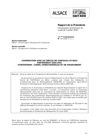 Dans le cadre de la Coopération décentralisée, il vous est proposé : - de poursuivre le partenariat entre le Département du Haut-Rhin et le Conseil du Cercle de YANFOLILA au MALI, conduit avec Grand Est Solidarités et Coopérations pour le Développement (GESCOD) et l’association Agriculteurs Français et Développement International du Haut-Rhin (AFDI 68), - d’approuver et d’autoriser la Présidente du Conseil départemental à signer les 3 conventions biennales 2020-2021, à savoir : la convention cadre, la convention opérationnelle ainsi que la convention de financement en faveur de GESCOD, coordinateur de cette coopération. Cette dernière convention précise les modalités de versement des subventions départementales qui s’élèvent à 29 000 € par an, soit au total 58 000 € pour les années 2020 et 2021. Ces aides sont accordées par décision de la Présidente en date du 3 juillet 2020, - d’autoriser le Département à percevoir les aides du Ministère de l’Europe et des Affaires Etrangères et de les reverser, le cas échéant, à GESCOD. Ce rapport a fait l’objet d’un avis favorable de la Commission Actions, Relations Internationales et Promotion du Bilinguisme le 5 juin 2020.