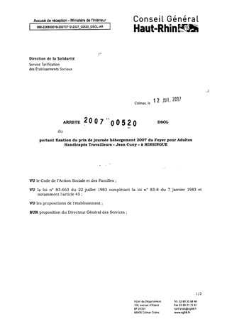 portant fixation du prix de journée hébergement 2007 du foyer pour adultes handicapés travailleurs "Jean Cuny" à HIRSINGUE. Resumé Pièces jointes ARRETE Assemblée : Non défini Date : 12/07/2007 Rapporteur : Non défini Collectivité : Conseil départemental du Haut-Rhin Direction : Non défini Service : Service de la Tarification des Etablissements Domaine : Prix de Journée Commission :