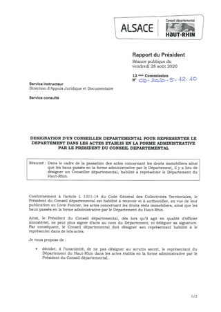 Dans le cadre de la passation des actes concernant les droits immobiliers ainsi que les baux passés en la forme administrative par le Département, il y a lieu de désigner un Conseiller départemental, habilité à représenter le Département du Haut-Rhin.