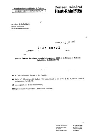 portant fixation du prix de journée hébergement 2007 de la maison de retraite spécialisée de HIRSINGUE. Resumé Pièces jointes ARRETE Assemblée : Non défini Date : 12/07/2007 Rapporteur : Non défini Collectivité : Conseil départemental du Haut-Rhin Direction : Non défini Service : Service de la Tarification des Etablissements Domaine : Prix de Journée Commission :