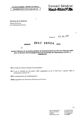 portant fixation de la dotation globale de fonctionnement au titre de l'exercice 2007 pour le service d'accompagnement à la vie sociale de l'association A.P.E.I. à HIRSINGUE. Resumé Pièces jointes ARRETE Assemblée : Non défini Date : 12/07/2007 Rapporteur : Non défini Collectivité : Conseil départemental du Haut-Rhin Direction : Non défini Service : Service de la Tarification des Etablissements Domaine : Dotations financières Commission :