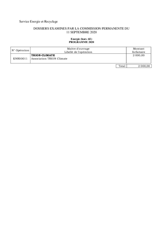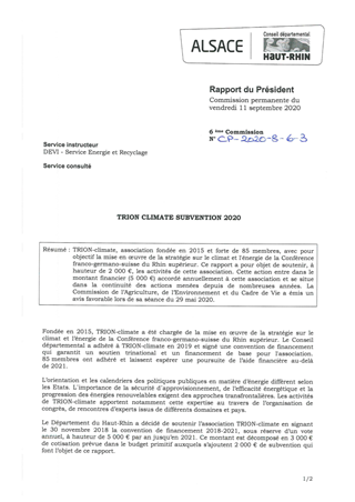 TRION-climate, association fondée en 2015 et forte de 85 membres, avec pour objectif la mise en œuvre de la stratégie sur le climat et l'énergie de la Conférence franco-germano-suisse du Rhin supérieur. Ce rapport a pour objet de soutenir, à hauteur de 2 000 €, les activités de cette association. Cette action entre dans le montant financier (5 000 €) accordé annuellement à cette association et se situe dans la continuité des actions menées depuis de nombreuses années. La Commission de l’Agriculture, de l’Environnement et du Cadre de Vie a émis un avis favorable lors de sa séance du 29 mai 2020.