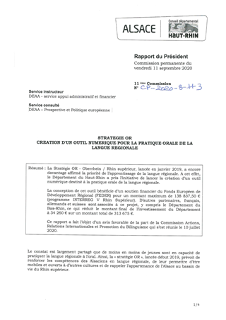 La Stratégie OR - Oberrhein / Rhin supérieur, lancée en janvier 2019, a encore davantage affirmé la priorité de l’apprentissage de la langue régionale. A cet effet, le Département du Haut-Rhin a pris l’initiative de lancer la création d’un outil numérique destiné à la pratique orale de la langue régionale. La conception de cet outil bénéficie d’un soutien financier du Fonds Européen de Développement Régional (FEDER) pour un montant maximum de 138 837,50 € (programme INTERREG V Rhin Supérieur). D’autres partenaires, français, allemands et suisses sont associés à ce projet, y compris le Département du Bas-Rhin, ce qui réduit le montant final de l’investissement du Département à 34 260 € sur un montant total de 313 675 €. Ce rapport a fait l’objet d’un avis favorable de la part de la Commission Actions, Relations Internationales et Promotion du Bilinguisme qui s’est réunie le 10 juillet 2020.
