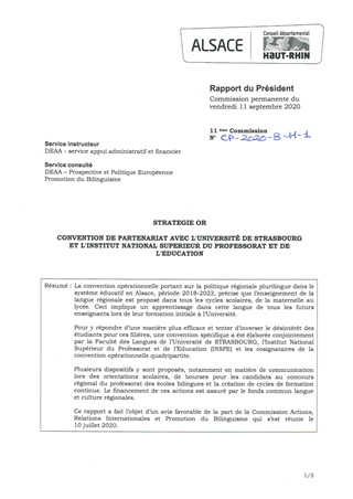 La convention opérationnelle portant sur la politique régionale plurilingue dans le système éducatif en Alsace, période 2018-2022, précise que l’enseignement de la langue régionale est proposé dans tous les cycles scolaires, de la maternelle au lycée. Ceci implique un apprentissage dans cette langue de tous les futurs enseignants lors de leur formation initiale à l’Université. Pour y répondre d’une manière plus efficace et tenter d’inverser le désintérêt des étudiants pour ces filières, une convention spécifique a été élaborée conjointement par la Faculté des Langues de l’Université de STRASBOURG, l’Institut National Supérieur du Professorat et de l’Education (INSPE) et les cosignataires de la convention opérationnelle quadripartite. Plusieurs dispositifs y sont proposés, notamment en matière de communication lors des orientations scolaires, de bourses pour les candidats au concours régional du professorat des écoles bilingues et la création de cycles de formation continue. Le financement de ces actions est assuré par le fonds commun langue et culture régionales. Ce rapport a fait l’objet d’un avis favorable de la part de la Commission Actions, Relations Internationales et Promotion du Bilinguisme qui s’est réunie le 10 juillet 2020.