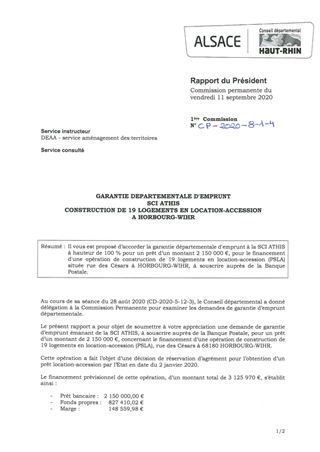 Il vous est proposé d’accorder la garantie départementale d'emprunt à la SCI ATHIS à hauteur de 100 % pour un prêt d’un montant 2 150 000 €, pour le financement d'une opération de construction de 19 logements en location-accession (PSLA) située rue des Césars à HORBOURG-WIHR, à souscrire auprès de la Banque Postale.