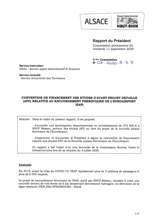 Dans le cadre du présent rapport, il est proposé : - d'accorder une participation départementale en investissement de 270 000 € à SNCF Réseau, porteur des études APD au titre du projet de la nouvelle liaison ferroviaire de l'EuroAirport, - d'approuver et d'autoriser le Président à signer la convention de financement relative aux études APD de la Nouvelle Liaison Ferroviaire de l'EuroAirport. Ce rapport a fait l'objet d'un avis favorable de la Commission Routes, Voirie et Infrastructures lors de sa réunion du 3 juillet 2020.