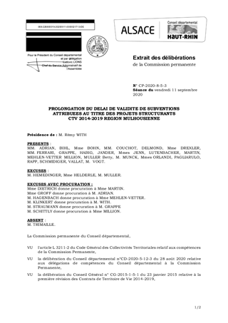 PROLONGATION DU DELAI DE VALIDITE DE SUBVENTIONS ATTRIBUEES AU TITRE DES PROJETS STRUCTURANTS CTV 2014-2019 REGION MULHOUSIENNE