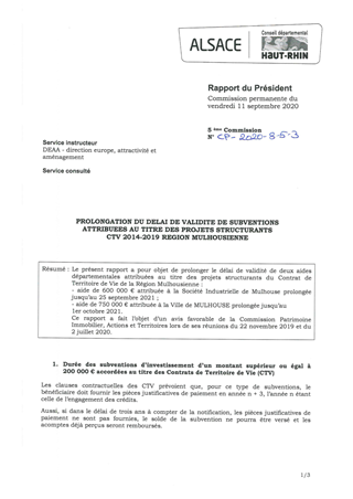 Le présent rapport a pour objet de prolonger le délai de validité de deux aides départementales attribuées au titre des projets structurants du Contrat de Territoire de Vie de la Région Mulhousienne : - aide de 600 000 € attribuée à la Société Industrielle de Mulhouse prolongée jusqu’au 25 septembre 2021 ; - aide de 750 000 € attribuée à la Ville de MULHOUSE prolongée jusqu’au 1er octobre 2021. Ce rapport a fait l’objet d’un avis favorable de la Commission Patrimoine Immobilier, Actions et Territoires lors de ses réunions du 22 novembre 2019 et du 2 juillet 2020.
