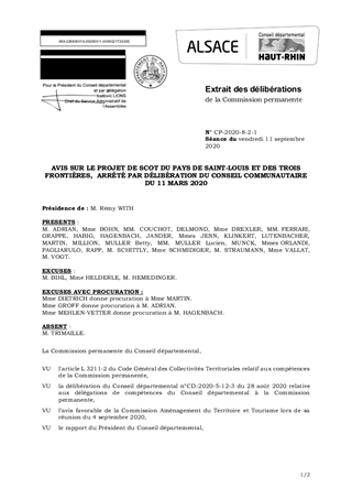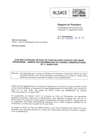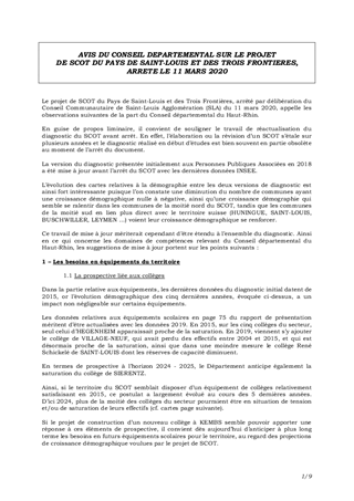 AVIS SUR LE PROJET DE SCOT DU PAYS DE SAINT-LOUIS ET DES TROIS FRONTIÈRES, ARRÊTÉ PAR DÉLIBÉRATION DU CONSEIL COMMUNAUTAIRE DU 11 MARS 2020