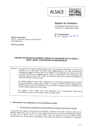 Le quartier de la gare à Saint-Louis est le seul quartier prioritaire au titre de la politique de la ville (QPV) de Saint-Louis Agglomération. De taille relativement modeste au regard d’autres QPV de la Région, il se démarque du reste de la ville de SAINT-LOUIS et de l’agglomération par la concentration d’une population en moyenne plus précaire. Sur le plan de l’habitat, plus de la moitié des logements collectifs relèvent du parc social. Le présent rapport a pour objet d’approuver la convention pluriannuelle du projet de renouvellement urbain du quartier de la gare à SAINT-LOUIS, cofinancé par l’ANRU dans le cadre du NPNRU, et d’en autoriser la signature par le Président du Conseil départemental du Haut-Rhin. Ce rapport a fait l’objet d’un avis favorable de la Commission Patrimoine Immobilier, Actions et Territoires réunie 2 juillet 2020.